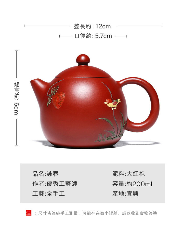 4分鐘前【經典器型 • 別出心裁】正宗宜興原礦大紅袍紫砂壺☞吳敏純手工匠心製作詠春龍蛋一壺四杯 - 大紅袍花香龍單壺200cc
