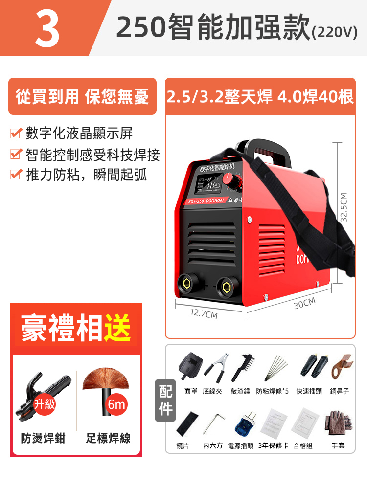 半小時前業內焊機領軍品牌【德國DOMHOAI】全新二代數字化電焊機,瞬間起弧,長焊4.0焊條 - 【250-220V】智能加强款+防燙焊鉗+6米焊線+大禮包