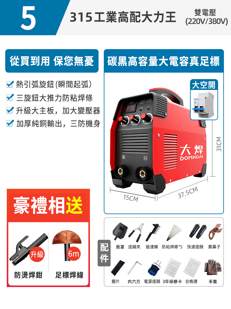 4分鐘前業內焊機領軍品牌【德國DOMHOAI】全新二代數字化電焊機,瞬間起弧,長焊4.0焊條 - 【315-220V/380V】智慧全電壓多板機+2米接地線+4米焊把線+大禮包