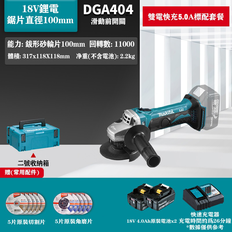 15分鐘前【Makita/牧田】DGA404 18V充電式砂輪機,變速!是同類產品中最安靜的角磨機之一 - 18V鋰電雙電快充5.0Ah組